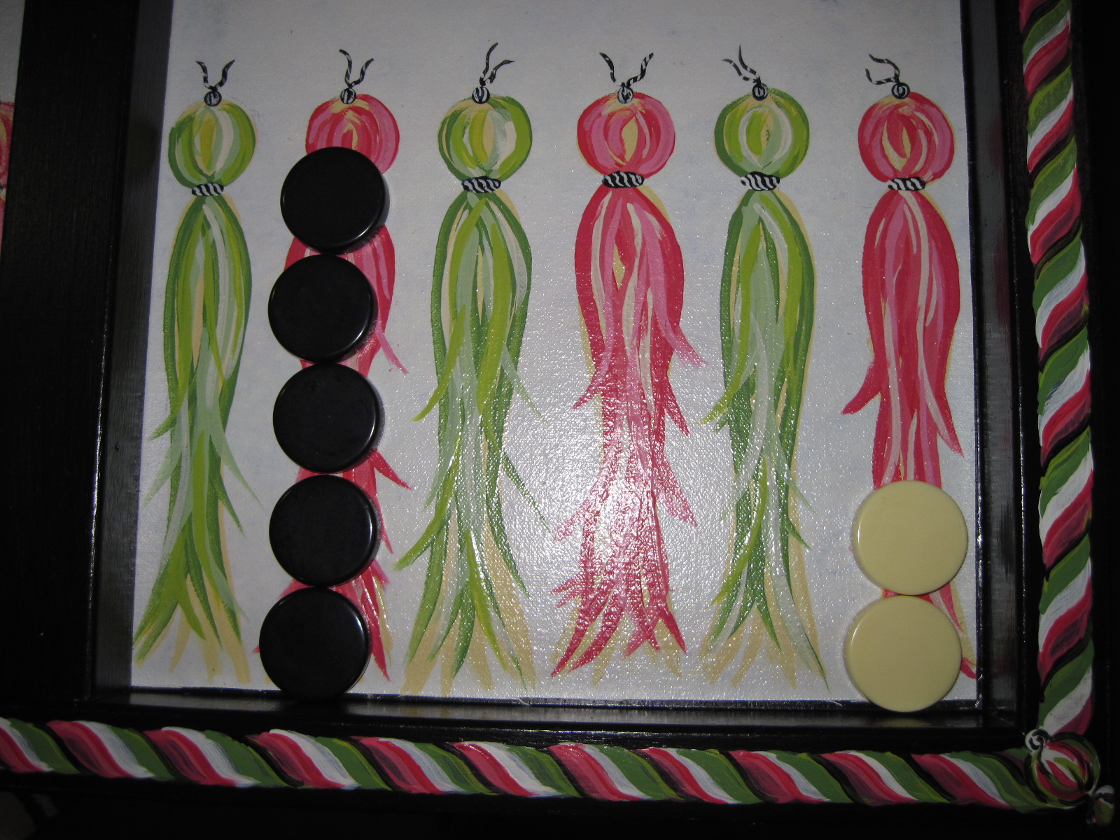 Whimisical and colorful, our tassle backgammon board can be done in any colors. The frame is a painted hardwood while the playing surface is painted canvas. $350